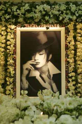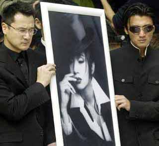 Hong Kong star Nicholas Tse (right) and an unidentified cousin of the late entertainer Anita Mui carry her portrait after she was cremated at Cape Colison crematorium in Hong Kong January 12, 2003. More than 1,000 sobbing fans waited for hours outside Hong Kong's main funeral home Monday to say goodbye to Mui, one of Asia's best loved Cantopop stars whose deep voice ruled local airwaves for years. Anita Mui, 40, died of cervical cancer December 30, 2003. [Reuters]