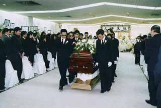 Pallbearers including Hong Kong singer-actor Andy Lau (front-R), fashion designer Eddie Lau (front-L), Malaysian actress Michelle Yeoh (2nd row-L) and Hong Kong actor Tony Leung (3rd row-L) carry the casket of Cantopop diva Anita Mui during her funeral in Hong Kong January 12, 2004. [Reuters]