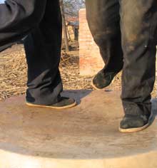With each stomping, the hide will expand a little and the stretchers will quickly take up the slack. The difficult thing is to make sure that every part of the hide is stretched at the same rate. This must be done if the drum is to endure the powerful beating and produce a deep, resonating, earth-shaking thunder for a long time to come.