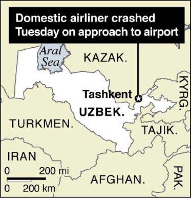 The map locates where a domestic airliner crashed Tuesday, Jan. 13, in heavy fog on approach to the airport in Uzbekistan's capital, Tashkent. Airport employees said 37 people were aboard and that all were believed killed.  [AP Graphic]
