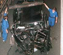 Police remove the wreckage of the car in which Princess Diana was travelling. A witness to the 1997 Paris crash has ruled out conspiracy theories, telling a British newspaper there were no other vehicles in sight when the smash happened. [AFP]