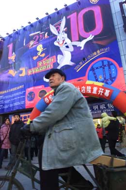 An elder Chinese cyclist passes the newly-opened Warnar-Wanda International Multiplex Cinema in Tianjin, Sunday, Jan. 18, 2004. [newsphoto]