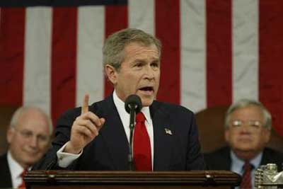 Bush warned that a "constitutional process" might be necessary if what he called "activist judges" allowed same-sex marriages. The unfolding presidential race provided a backdrop for the speech. It was delivered one day after Iowa Democrats boosted the candidacy of Sen. John Kerry of Massachusetts, sending him onto the New Hampshire primary with a strong first-place finish in the state caucuses. Without ever explicitly referring to the unfolding race, Bush began his speech by noting that Americans "face a choice" and he warned against turning back to "old policies and old divisions." Bush's speech came at a time when Americans, as indicated by polls, remain worried about the economy and the war in Iraq. A CNN/USA Today/Gallup poll released January 20 found that 53 percent of Americans are dissatisfied with how things are going in the United States, compared with 46 percent who said they are satisfied. The poll had a sampling error of plus or minus 3 percentage points. The speech, delivered under extraordinary security and interrupted numerous times with lopsided partisan applause, lasted about 54 minutes. Four members of Congress -- two Democrats and two Republicans -- did not attend the president's address, following the wishes of congressional leaders who said they had to consider the possibility of a catastrophic attack on the Capitol. The president routinely keeps one member of his Cabinet from entering the House chamber for the speech, a practice followed by Congress since the terrorist attacks of September 11, 2001. On the international front, Bush turned to the controversy of weapons of mass destruction in Iraq. None have been found -- despite warnings of them before the war -- and U.S. troops continue to be killed there. Bush referred to program "activities" and said the United States was right to topple Iraqi leader Saddam Hussein, who is now in U.S. custody. "Had we failed to act, the dictator's weapons of mass destruction programs would continue to this day," Bush declared. And Bush said the United States faces a real threat of another terrorist attack. "Twenty-eight months have passed since September 11, 2001," Bush said. "Over two years without an attack on American soil, and it is tempting to believe that the danger is behind us. That hope is understandable, comforting -- and false." Iraqi Governing Council President Adnan Pachachi was one of Bush's guests in the House chamber. Pachachi was in New York earlier in the day for meetings at the United Nations. (Courtesy of Cnn.com)