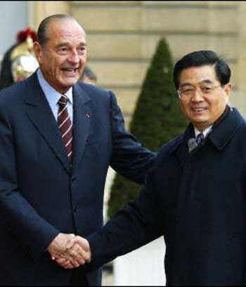 French President Jacques Chirac (L) with his Chinese counterpart Hu Jintao in Paris. China Southern Airlines recently agreed to buy 21 Airbus aircraft, Hu told a press conference. [AFP]