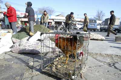 A chicken is left in its cage at an outdoor market in Beijing on February 2, 2004. Chicken vendors in China's capital said business had declined an estimated 70 percent since the outbreak of bird flu on the mainland. [Reuters]