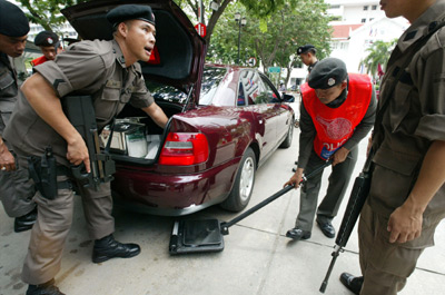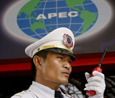 | | |  | | | Asia-Pacific Economic Cooperation (APEC) leaders pose during a group photo session at Ananta Samakhom Throne Hall in Bangkok October 21, 2003. The APEC leaders are (L-R) Russian President Vladimir Putin, Vietnamese Prime Minister Phan Van Khai, Chinese President Hu Jintao, South Korean President Roh Moo-hyun and Australian Prime Minister John Howard. [Reuters] | | | | | | | | | | | | |  | | | Russian President Vladimir Putin (L) is led by Thai Prime Minister Thaksin Shinawatra (R) to a conference room at the Goverment House in Bangkok October 20, 2003 to attend the summit meeting of the Asia-Pacific Economic Cooperation (APEC). An unidentified official is seen in the centre.[Reuters] | | | | | | | | | | | | |  | | | U.S. President George W. Bush (2nd R), Indonesian President Megawati Sukarnoputri (L) and Taiwan envoy Lee Yuan-Tseh (2nd L) enter into a conference room at the Goverment House in Bangkok October 20, 2003 to attend the summit meeting of the Asia-Pacific Economic Cooperation (APEC). [Reuters] | | | | | | | | | | | | |  | | | Chinese President Hu Jintao (right) shakes hands with Japanese Prime Minister Junichiro Koizumi prior to their bilateral talks on the sidelines of the Asia-Pacific Economic Cooperation (APEC) summit in Bangkok, October 20, 2003. Pacific Rim nations have agreed to join forces to dismantle transnational terrorist groups that threaten their economies and to push for swift progress in stalled world trade talks, their final draft communique said. [Reuters] | | | | | | | | | | | | |  | | | U.S. President George W Bush (R) talks with South Korean President Roh Moo-hyun during a working breakfast in Bangkok, October 20, 2003. Bush and Roh discussed a nuclear weapon-free Korean peninsula during their meeting prior to the annual APEC meeting in Bangkok later Monday. [Reuters] | | | | | | | | | | | | |  | | | Chinese President Hu Jintao smiles during the meeting of the leaders of the Asia-Pacific Economic Cooperation (APEC) at the government house in Bangkok October 20, 2003. [Reuters] | | | | | | | | | | | | |  | | | Mexican President Vicente Fox (L) chats with Thai Prime Minister Thaksin Shinawatra after their bilateral meeting in Bangkok October 19, 2003. Leaders of 21-member economies of the Asia-Pacific Economic Cooperation (APEC) are gathering in the capital of Thailand to attend the annual APEC summit.[Reuters] | | | | | | | | | | | | |  | | | Chinese President Hu Jintao meets with US President George W. Bush before the annual Asian-Pacific Economic Co-operation (APEC) meeting in Bangkok, Thailand October 19, 2003. [Reuters] Bush indicated the United States will not change its policy on Taiwan and will stick to backing the one-China policy in opposing independence for Taiwan. [Reuters] | | | | | | | | | | | | |  | | | Chinese President Hu Jintao waves upon his arrival outside the Shangri-La hotel in Bangkok. Hu Jintao arrived for a state visit to Thailand and the APEC summit.[AFP] | | | | | | | | | | | | |  | | | Mask maker Sorapong Pongsuk put finishing touches to masks worn at tradtional Thai dance in Ayutthaya, 80 km (50 miles) north of Bangkok, October 16, 2003. These masks will be presented as part of the official gifts to leaders of the 21-member Asia-Pacific Economic Cooperation (APEC) during their meeting in the Thai capital. Picture taken October 16, 2003. [Reuters] | | | | | | | | | | | | |  | | | South Korean President Roh Moo-hyun talks to the press during a working breakfast with U.S. President George W. Bush in Bangkok, October 20, 2003. Bush and Roh discussed a nuclear weapon-free Korean peninsula during their meeting prior to the annual APEC meeting in Bangkok later Monday. [Reuters] | | | | | | | | | | | | |  | | | U.S. President George W. Bush talks to the press during his meeting with South Korean President Roh Moo-hyun during a working breakfast in Bangkok, October 20, 2003. Bush and Roh discussed a nuclear weapon-free Korean peninsula during their meeting prior to the annual APEC meeting in Bangkok later Monday. [Reuters] | | | | | | | | | | | | |  | | | Russian president Vladimir Putin makes a speach during the Asia-Pacific Economic Cooperation (APEC) CEO summit in Bangkok October 19, 2003. [Reuters] | | | | | | | | | | | | |  | | | Peruvian President Alejandro Toledo delivers a speech during the CEO Summit of the Asia-Pacific Economic Cooperation (APEC) in Bangkok October 19, 2003. [Reuters] | | | | | | | | | | | | |  | | | Thai Prime Minister Thaksin Shinawatra speaks during a rehearsal for the upcoming Asia-Pacific Economic Cooperation (APEC) meeting at the government house in Bangkok October 15, 2003. APEC economic leaders have outlined counter-terrorism and economic growth as priorities for the meeting later in the week. [Reuters] | | | | | | | | | | | | |  | | | Two Thai Airways flight attendants act as models during a fashion show held on board a passenger flight from Bangkok to Phuket October 15, 2003. The fashion show was staged as part of a promotion for the upcoming Asia-Pacific Economic Cooperation (APEC) meeting taking place this weekend in Thailand. APEC economic leaders have outlined counter-terrorism and economic growth as priorities for the meeting later in the week.[Reuters] | | | | | | | | | | | | |  | | | Thai policemen inspect a car at a checkpoint in Bangkok October 17, 2003. Security has been tightened during the Asia-Pacific Economic Cooperation (APEC) forum. [Reuters] | | | | | | | | | | | | |  | | | U.S. President George W. Bush and First Lady Laura Bush wave upon their arrival at Tokyo's Haneda Airport October 17, 2003. Bush arrived in Japan on Friday to start a six-nation sweep through Asia that will be dominated by issues of security, counter-terrorism and trade.[Reuters] | | | | | | | | | | | | |  | | | A security guard talks on a walkie talkie at a venue for the Asia-Pacific Economic Cooperation (APEC) in Bangkok October 15, 2003. APEC economic leaders have outlined counter-terrorism and economi