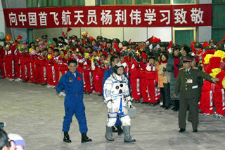 | | |  | | | China's first astronaut Yang Liwei waves to astronaut at the Hong Kong Stadium November 1, 2003. [newsphoto] | | | | | | | | | | | | |  | | | HK people crowd the the Hong Kong Stadium November 1, 2003 to get a glimpse of Yang Liwei, China's first astronaut. | | | | | | | | | | | | |  | | | Premier Wen Jiabao and other Chinese leaders applaud the success of China's first manned spaceflight.[Xinhua] | | | | | | | | | | | | |  | | | Yang displays China's national flag and the flag of the United Nations in outer space. | | | | | | | | | | | | |  | | | China's first manned spaceship - Shenzhou V (Divine Vessel V) blasts off into space at the Jiu Quan Satellite Launch Center in Northwest China's Gansu Province at 9:00am Wednesday morning October 15, 2003. The control center described the launch as a success. [Xinhua] | | | | | | | | | | | | |  | | | Yang Liwei, China's first space man, waves to the recovery teams after walking out of the return capsule of the Shenzhou V spaceship Thursday morning, October 16. | | | | | | | | | | | | |  | | | The control center for the Shenzhou V spaceship. | | | | | | | | | | | | |  | | | Yang Liwei is ready for mission. | | | | | | | | | | | | |  | | | Yang Liwei in training | | | | | | | | | | | | |  | | | Yang Liwei, his wife and his son | | | | | | | | | | | | |  | | | Yang Liwei, China's first space man, waves to the recovery teams after walking out of the return capsule of the Shenzhou V spaceship Thursday morning, October 16. [Xinhua] | | | | | | | | | | | | |  | | | photoelectricity telescope operators get ready for the launch of Shenzhou II January 10, 2001 | | | | | | | | | | | | |  | | | apartment for the astronauts | | | | | | | | | | | | |  | | | Spaceflight Memorial Tower of the Jiuquan Launch Center | | | | | | | | | | | | |  | | | rocket launching tower in Jiuquan | | | | | | | | | | | | |  | | | Spaceflight Memorial Tower of the Jiuquan Launch Center | | | | | | | | | | | | |  | | | A simulated astronaut is shown inside the landing capsule of the 'Shenzhou IV' spacecraft after it landed in Inner Mongolia, in north China, in this Jan. 5, 2003 photo. After 11 years of planning, China is on the brink of joining the elite of spacefaring nations.[AP]