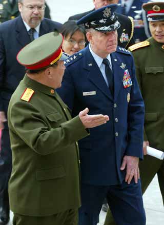 Liang Guanglie (left), chief of General Staff of the People's Liberation Army, talks with U.S. Air Force General Richard Myers, chairman of the Joint Chiefs of Staff, during a welcome ceremony in Beijing January 14, 2004. During his two-day visit, Myers are scheduled to meet with Chinese military leaders and government leaders. Mutual military exchanges, security co-operation, and Taiwan question are expected to be touched upon, officials said. [newsphoto]