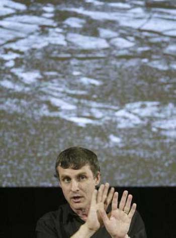 Laboratory in Pasadena, California January 25, 2004. Behind Squyres is a photo