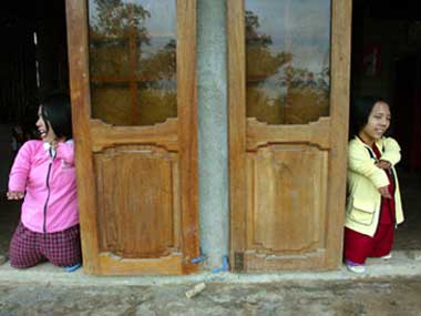 and 12 fingers, stand at their front door at their home in Dong Ha, north
