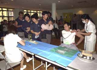 Workers with the Health Bureau of the Macao Special Administrative Region give inoculations to poultry vendors yesterday. The local government has stepped up precautionary measures to prevent an outbreak of bird flu. [newsphoto] |