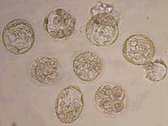 A microscopic photo released by Seoul National University shows eight of the cloned embryos.  [AP]