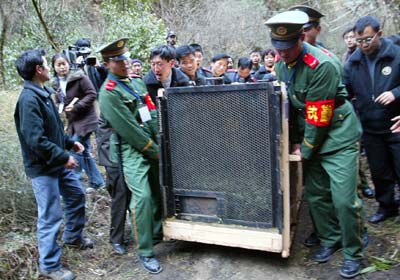 At 3:50 p.m., she was sent to her new dwelling in a mountain valley in Bailonggou, 1 km from the giant panda research center. No other wild animals live in Bailonggou as it is encircled on three sides by 3,000-m mountains, and only one path links Bailonggou to the outside world. Hua Mei, or "China America", born in the United States in 1999,set foot in China for the first time when she arrived in Beijing Thursday afternoon after a 10-hour flight. She was received as a VIP. Facing the new, quiet environment of Bailonggou, Hua Mei was disconcerted and reluctant to leave the cage. Still dozy, she went to sleep in the cage, keeping the spectators in suspense. She woke up at 5:40 p.m., but lingered in the cage, staring at the new surroundings in confusion. Keepers tried to lure her out, but she settled down to eat bamboo. Twenty minutes later, she appeared to brace herself, and walked out in a reserved manner. Hua Mei's new home consists of a 120-sq-m hillside field encircled by an iron fence, and a 16-sq-m log cabin, installed with heating facilities. Hua Mei sniffed around in the field in which bamboo and 10 wildtrees grow. Construction of the new dwelling for Hua Mei started on Feb. 6 and was nearly finished, said researchers, adding that the buildings had passed inspection by the Sichuan administration for entry-exit inspection and quarantine. The dwelling was built at a cost of 60,000 yuan (US$7,220), they added.