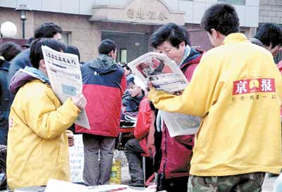 Sales clerks hawk copies of the recently established Beijing News, published by a joint venture between Beijing-based Guangming Daily and Guangzhou-based Nanfang Daily. Industry insiders suggest reform of China's media, especially involving ownership, has resumed, which may partially open State-owned media organizations' business management to non-governmental investment. The reform was halted last year during the outbreak of the severe acute respiratory syndrome.