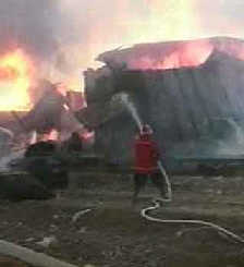 Television footage shows firefighters working to extinguish the fire left by deadly train car explosions in northeast Iran February 18, 2004. [Reuters]