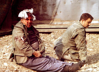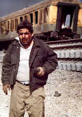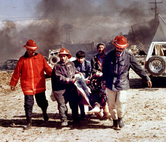 Rescue workers carry a victim from the train wreckage after a train exploded near Nishapur, 700 kilometers east of Tehran, February 18, 2004.[Reuters]