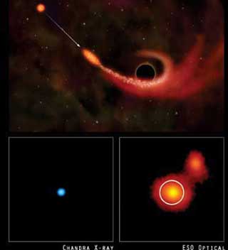 A big black hole ripped apart a sun-like star, gobbled a bit of it and flung the rest out into the cosmic neighborhood in an act of celestial gluttony caught by two orbiting observatories, scientists said on Wednesday. The doomed star probably went off-course and into the supermassive black hole's path after a close encounter with another star, according to astronomers using NASA's Chandra X-ray Observatory and the European Space Agency's XMM-Newton X-ray Observatory. As the star approached the heart of a galaxy some 700 million light-years from Earth, the black hole lurking there stretched the star and ultimately tore it into bits. A light-year is about 6 trillion miles, the distance light travels in a year.