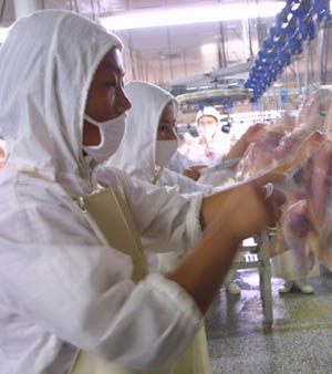 Workers at Shandong Fengxiang Group in east China's Shandong Province process chicken on February 19, 2004 for exports to Japan. More than 40 countries imposed import ban after bird flu outbreaks were reported in China in late January. Some countries have lifted the ban.[newsphoto] |