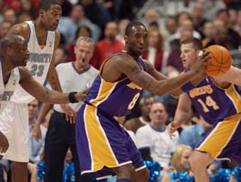 Los Angeles Lakers forward Kobe Bryant, center, looks to pass under defensive pressure from Denver Nuggets guard Voshon Lenard, front left, and center Marcus Camby during the first quarter in Denver on Wednesday, Feb. 25, 2004. [AP]