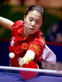Wang Nan knocks back a hit during the duel with German player Elke Wosik March 3, 2004, the first day of the world team table tennis championships in Doha, Qatar. [newsphoto]