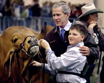 Tobie Martin, from Gilmer, Texas, shows U.S. President George W. Bush his competition Brahman cow at the Houston Livestock Show, March 8, 2004. Bush was in Houston to attend an evening campaign fund-raising dinner. [Reuters]