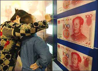 A woman and her son get a close up view of a Chinese 100-yuan note at an exhibition in Beijing. China's currency peg is a hot-button issue for President George W. Bush as he heads to an Asia-Pacific summit pressing for freer exchange rates in a bid to ease the crushing US trade deficit and revive the sagging US labor market. [AFP/file]