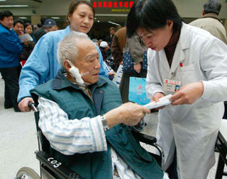 Wang Shuyue, a 77-year-old Alzheimer's patient, consults a doctor March 11, 2004 at a Beijing hospital. Many medical workers participated in a campaign launched by the China Committee of Alzheimer's Disease International and provided free diagnosis and consulting to patients. [newsphoto]