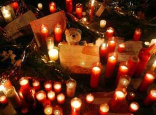 A sign reads 'For the children, victims of this injust attack' during a candle vigil outside Madrid's Santa Eugenia train station after an estimated 192 people were killed by bombs placed in commuter trains March 11, 2004 during the morning rush-hour in Madrid in Spain's worst terrorist attack ever. [AP]