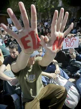 A protester holds up his hands with 'ETA No' written on them during a demonstration in Almeria, Spain, Thursday March 11, 2004 to protest the attacks on trains in Madrid that killed at least 192 people and injured another 1,200.  [AP]