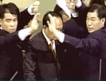Lawmakers and security personnel protect the speaker as he reads the result of the vote. [AP]