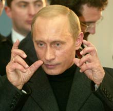 Russian President Vladimir Putin gestures as he speaks to media in Moscow in the early hours of March 15, 2004. Putin swept back into the Kremlin on Sunday with a landslide election win. [Reuters]
