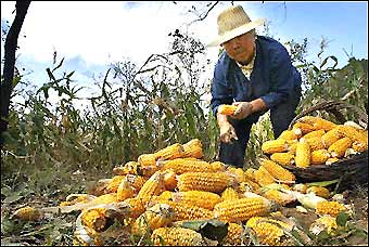 A Chinese farmer harvests corn in the field.[AFP/file]