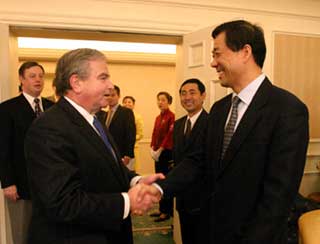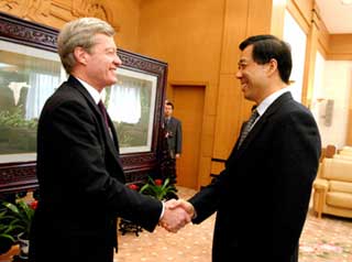 Minister of Commerce Bo Xilai (right) shakes hands with US senator Max Baucus on March 16 before their meeting on Chin-US trade in Beijing. [mofcom.gov.cn]