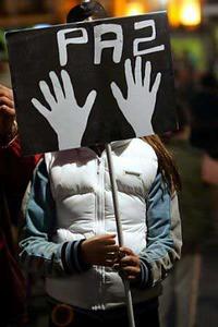 A girl holds up a banner reading 'peace' during a march in honor of the victims of Madrid's bombings, in the Spanish city of Alcala de Henares, one of the worst hit communities, March 16, 2004.  [Reuters]