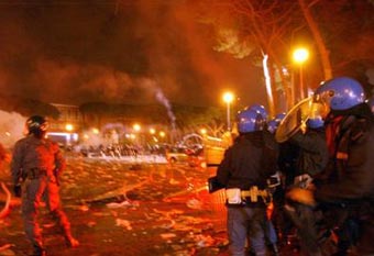 Italian carabinieri military police clash with fans outside Rome's Olympic stadium after the Italian Series A top league soccer match between Lazio and Roma was suspended amid fears of breakdown of public order, immediate reports said, Sunday March 21, 2004. [AP]