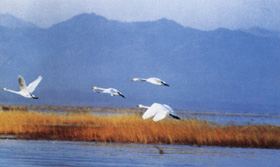 The lake, covering 2,000 hectares of water area and 3,300 hectares of wetland and grassland, has recently been designated a protection zone for birds. It is a perfect habitat for birds, according to zoologists. A large number of white swans first flew to the lake in 1996, and then gathered there every spring. This year has seen more than ever, according to observers. Since 1997, trees and grassy vegetation has been planted around the lake to improve the environment and attract more birds. In addition to swans, more than 150 species of birds including geese, cormorants, wild ducks, grey heron, great egret, Eurasian spoonbill and black cranes can been found at the lake. The number of wild ducks in spring has in the past topped 10,000. Yeya Lake is the largest wetland bird habitat near the city. The best time to watch birds is between 6am and 7am and 6pm to 8pm, when birds leave for food or come back for rest. Quadrangle courtyards were built nearby to offer accommodation and dining for birdwatchers. Another good spot in Yanqing for birdwatching is Baihebao Lake. Around 50 million cubic metres of water from the lake was recently diverted to Miyun Reservoir to relieve Beijing's drinking water shortage. The water's lower level attracts lots of wild birds to look for food in the lake. Thousands of different birds come to the lake everyday and their dance in the sky presents a fantastic scene for visitors. Wuling Mountain, about 200 kilometres east of Beijing, also boasts most of the mountain birds that can be found around Beijing.