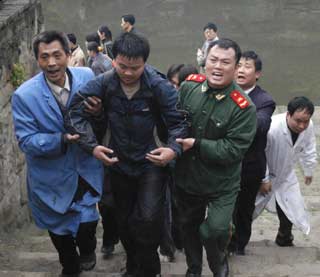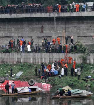 A city bus drove off a road into a river in Zigong, Sichuan Province, in Southwest China when it went out of control Wednesday, killing 15 people and injuring 39 -- 5 seriously. Rescuers managed to save the injured parties from the deep river who were then taken to a hospital for treatment. The driver, 24-year-old Li Yan, was held for questioning April 1, 2004. [Xinhua]