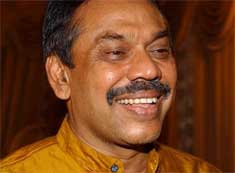 Mahinda Rajapakse, Sri Lanka's new Prime Minister laughs with supporters at his resident in Colombo, Sri Lanka early Tuesday, April 6, 2004. [AP]