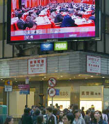 The National People's Congress Standing Committee's approval of interpretations to two clauses in the annexes to the Basic Law of Hong Kong are broadcast at the Times Square in the territory's downtown April 6, 2004. [newsphoto]