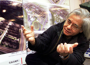 Lin Xiangxiong, explains to onlookers the features of his design for the Olympic Village, which is on display at Beijing Tianhong Yuanfang Architecture Design Co Ltd, the Chinese partner in Lin's design bid. [file photo]
