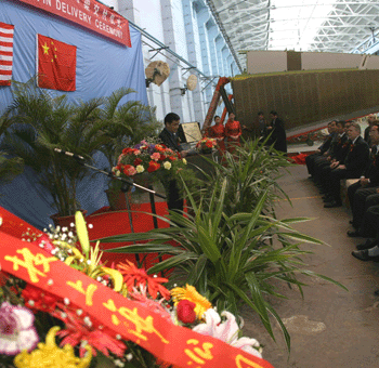 Participants at the delivery ceremony of the 1,000th vertical fin made by Xi'an Aircraft Industry Group Co Ltd (XAC) for Boeing 737s yesterday in Xi'an, capital of Northwest China's Shaanxi Province. US aviation giant Boeing hopes its Chinese suppliers will be among its global partners and work together with it on its future development. [newsphoto]