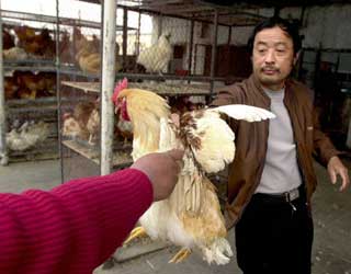 A vendor shows a chicken to a customer at the Baliqiao market in Beijing on Saturday, after the city allowed the resumption of the live poultry trade. But retailers at the market said there were more questions than sales at the weekend as the nation puts the potentially fatal bird flu disease behind it.