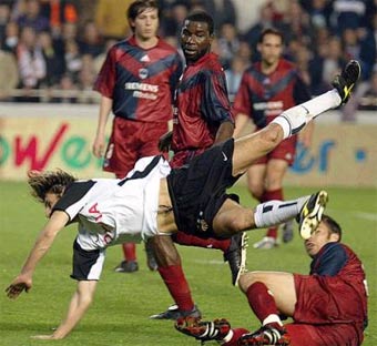 'For us to meet Valencia in the semis is a really important step for a club like ours, said Villarreal coach Francisco 'Paquito' Garcia. 'I was a player at Valencia and hold the club close to my heart but now I'm with Villarreal and, of course, I want them to win.' 'The club has never made a semi-final like this in its history and we're going to make sure we enjoy it and at the same time make life as difficult as possible for Valencia.' Primera Liga leaders Valencia, Champions League runners-up in 2000 and 2001, booked their place in the last four by easing past Girondins Bordeaux 2-1 at home to go through 4-2 overall. Former European champions Olympique Marseille will play England's Newcastle United in the other semi-final. A second-half goal from Camel Meriem handed Ligue 1 Marseille a 1-0 victory over three-times winners Inter at the San Siro to seal a 2-0 passage. It was Inter's first defeat against French opposition in 10 European ties and leaves Italy without a representative in the semi-finals of either of the two European club competitions. Newcastle, who last tasted European success in 1969 when they lifted the Fairs Cup, the forerunner to the UEFA Cup, sunk PSV Eindhoven 2-1 at St James' Park to go through 3-2 over the two legs. Villarreal kept up their record of not conceding a goal at home in their first season in European competition by shutting out Celtic who lost last year's final to Porto, the Portuguese side who have reached this year's Champions League semi-finals. Villarreal, who have now taken the scalps of Celtic, AS Roma, Galatasaray, Torpedo Moscow and Trabzonspor, stunned the Scottish side before they had even settled. Right back Belletti sent a high cross into the box from just past the halfway line and former Barcelona and Olympique Lyon striker Anderson stole between the centre-backs to head over the advancing goalkeeper David Marshall after six minutes. Anderson missed another good chance two minutes before the interval but he made up for that when he laid on the second for Roger to volley home in the 68th minute. The one disappointment for Villarreal came from the second-half booking of captain Rodolfo Arruabarrena, who will miss the first leg of the semi-final on April 22. A fine solo goal from Marseille's Meriem, who burst from inside his own half and unleashed a low shot past Francesco Toldo, took the 1999 beaten finalists through against lacklustre Inter. The Serie A side could have few complaints after struggling to turn their midfield possession into clear cut chances against a rock solid Marseille defence. 'We've now beaten Liverpool and Inter so I think we're allowed to dream of winning this Cup,' said Marseille coach Jose Anigo. Newcastle took an early lead against PSV when former England forward Alan Shearer headed home a Lauren Robert corner at the near post on nine minutes. Prolific Serbia and Montenegro striker Mateja Kezman hauled the Dutch side level with a penalty seven minutes after the break after Olivier Bernard chopped down Park Ji-sung. But Gary Speed took Newcastle through when he headed home another Robert corner after 66 minutes. 'I said before the first leg of this tie that one goal would be the difference between the two sides... and so it proved,' said Newcastle manager Bobby Robson who once coached PSV. Second-half goals from Mauricio Pellegrino and Francisco Rufete secured Valencia's passage at the Mestalla against Bordeaux, who replied through Eduardo Costa. The semi-final first and second leg ties take place on April 22 and May 6. The final is in Gothenburg on May 19. |