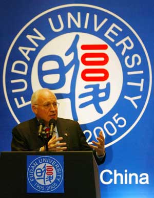 "Just as the US President Bush said, the United States supports one-China policy, based on the three US-China joint communiques." He said one important thing is that discussions and dialogues should be held between Beijing and Taiwan and the United States opposes any unilateral actions to change the status quo. In response to a student's question on nuclear issues in the Korean Peninsula, the vice president said a nuclear-free Korean Peninsula entails the nodding of the Democratic People's Republic of Korea (DPRK) for the complete,verifiable and irreversible dismantlement of its nuclear facilities. The US side hopes the parties should work together to persuade the DPRK to reach the goal. He said the United States was"encouraged" by China's leading role in the field. Cheney said curbing the spread of weapons of mass destruction is of great urgency in the new century and the US side has no choice but persist.