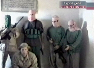 The poor-quality tape aired by Al Jazeera shows a white male identifying himself as Pfc. Keith Matthew Maupin dressed in military fatigues sitting on the floor surrounded by masked gunmen April 16, 2004.  [Reuters]