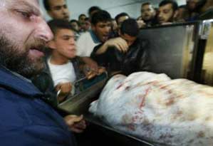 Palestinians gather around the body of Hamas leader in Gaza, Dr Abdel Aziz Rantisi, at the Shifa Hospital morgue following an Israeli missle strike in Gaza City April 17, 2004. [AP]