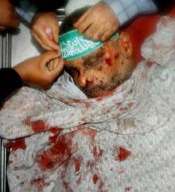 Palestinian mourners in Gaza put a Hamas headband on Hamas leader Dr Abdel Aziz Rantisi as they gather in the morgue at Shifa Hospital in Gaza City, April 17, 2004. Rantisi and two of his bodyguards were killed when an Israeli missile strike blew up their car. [AP]
