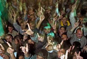 Palestinian Hamas supporters at Rafah refugee camp shout slogans after the killing of Hamas leader Abdel Aziz Rantisi in the south of the Gaza Strip April 18 2004.[AP]