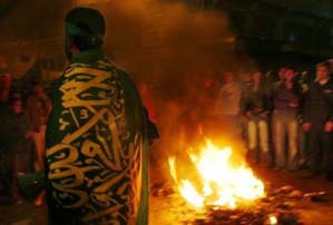 A man (L) is shown wearing an Islamic flag used by Hamas as their symbol among Palestinian Hamas supporters demonstrating after the killing of Hamas leader Abdel Aziz Rantisi in an Israeli missle strike in the West Bank town of Ramallah, Gaza, April 17, 2004.  [AP]