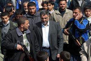 Hamas leader Abdel Aziz Rantisi (C) surrounded by bodyguards leads a Hamas demonstration March 7, 2003 in the Jabaliya refugee camp in the Gaza Strip before he was killed in an Israeli missile strike April 17. [AP]
